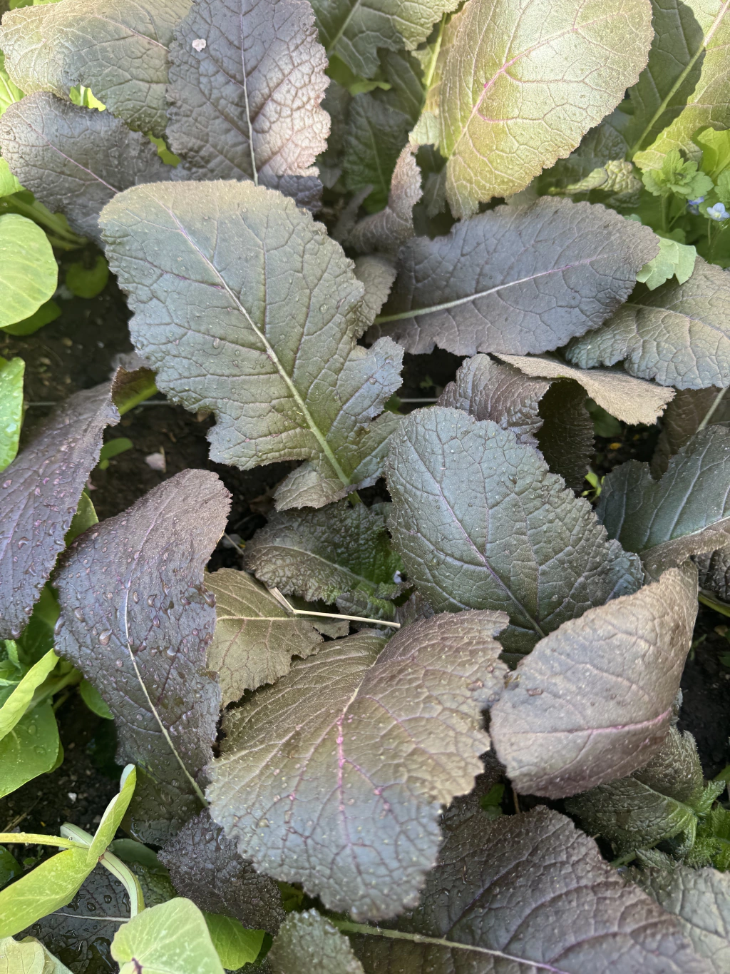 - Color: Las hojas de la mostaza Lengua de Dragón tienen un color verde intenso con venas púrpuras, lo que les da un aspecto dramático y ornamental.