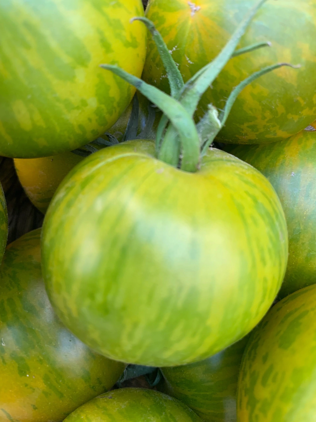 La piel es suave y tensa con una base de color verde claro, cubierta de rayas verticales más claras. A medida que el tomate madura, las rayas se transformarán de verde pálido a amarillo dorado.
